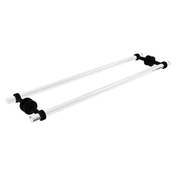 This beautiful back-to-back shower door towel bar adds elegance and convenience to any bathroom decor. It features identical bars for installation on both sides of glass shower doors or walls. Securely attaching to any glass surface, it complements bathroom decor ranging from modern to traditional and all styles in between. Bold use of clear acrylic creates an almost hypnotic look against the solid brass construction. This stylish towel holder is extremely attractive yet highly functional.