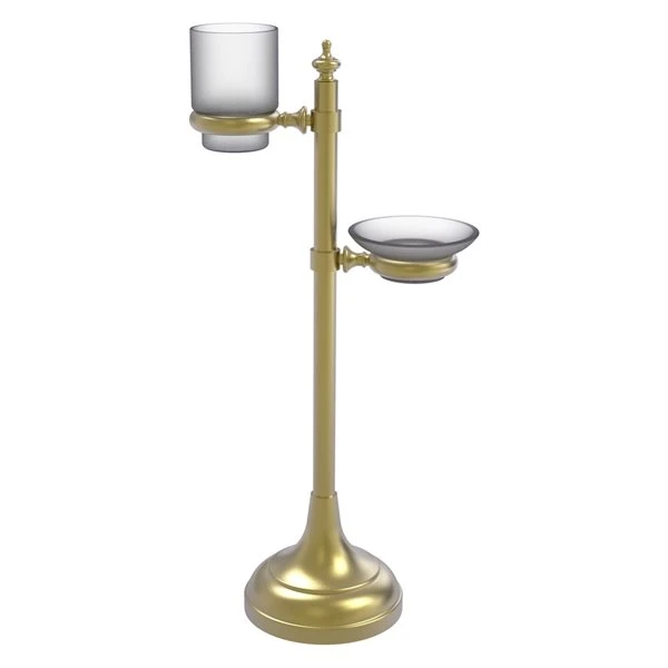 This elegantly designed free standing multi-accessory ring stand provides versatility, convenience and style for your vanity top. Use the included tumbler and soap dish on the stand. You can also use the rings to support other bathroom items. Accessory stand can be used to hold anything that will fit in the rings. Crafted of the finest solid brass materials and provided with one of our designer lifetime finishes. Sturdy solid brass base will keep the stand secure.