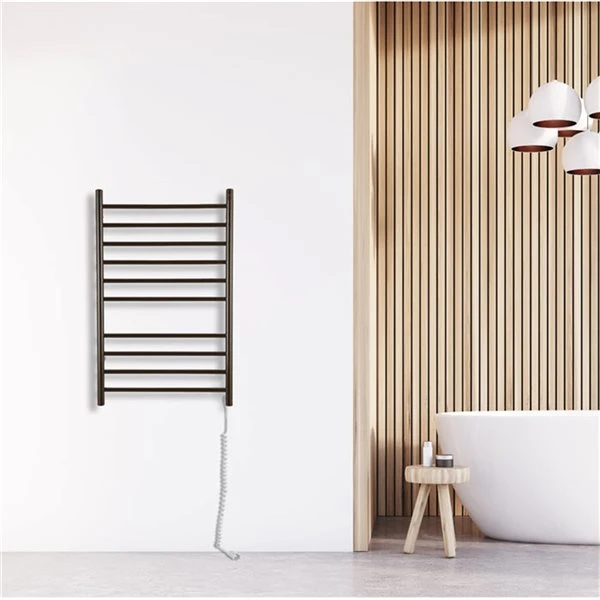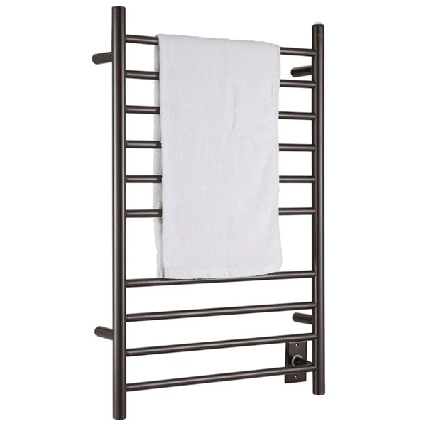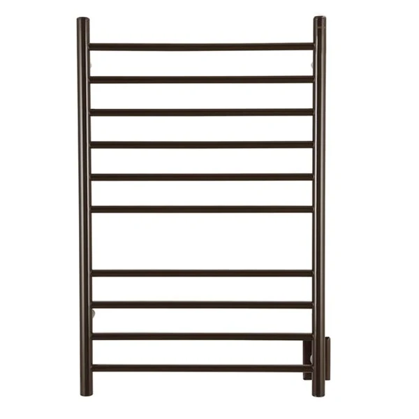Crafted in high-quality stainless steel with a rich oil-rubbed bronze finish, this versatile wall-mounted towel warmer and drying rack offers a discreet hardwire or convenient plug-in installation option. 10 rounded bars heat up in minutes and can easily accommodate several towels at once. This elegant towel warmer is an eco-friendly way to keep your clothes and towels dry and warm in any weather.