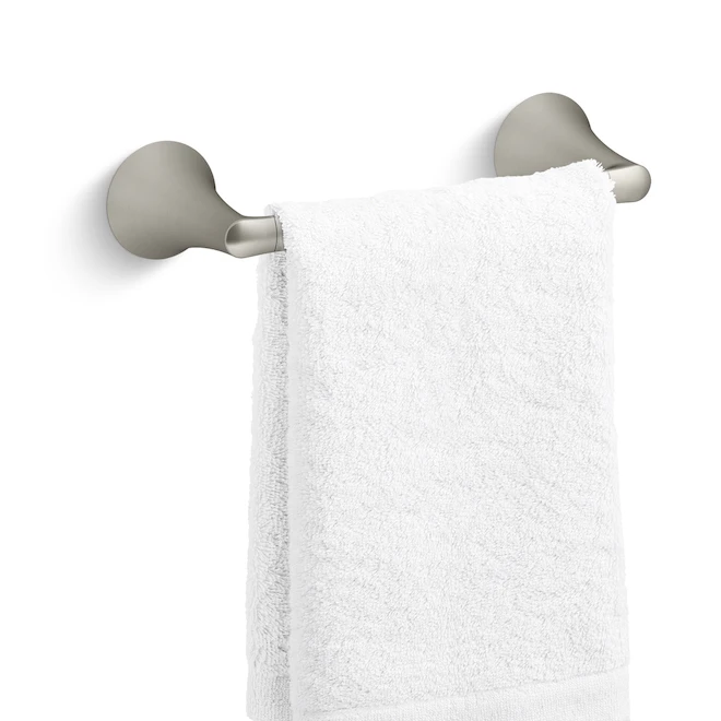 Clean lines, soft curves, and an art deco inspired design give this Kohler Lilyfield hand towel bar an elegant look. The brushed nickel finish makes it a perfect choice for your modern bathroom. Made of premium metal, this bathroom accessory resists corrosion and tarnish so that it stays looking great. Pair this towel holder with other Kohler Lilyfield faucets and accessories to bring a coordinated look to your space. 1-year warranty.