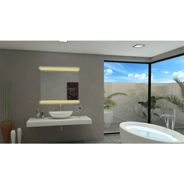 This backlit mirror adds both ambiance and practicality to your bathroom. Measuring 40 inches wide and 35 inches tall, this mirror features two bands of 24-volt dimmable LED lights. Located behind frosted edges, this integrated lighting solution is both discreet and functional, allowing you to never miss a detail. This product is backed up a 5-year limited warranty.