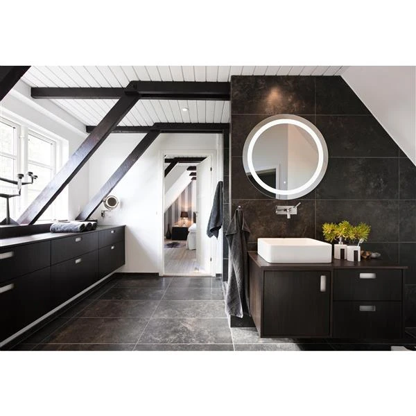 Unique and beautiful represent the Marilyn, from WarmlyYours’ Marquee Series of LED mirrors. This curvaceous, circular mirror improves any room with vibrant, full-spectrum lighting and an alluring, organic design. The wall-mounted Marilyn features 3/16” silvered glass and a 27.5” diameter. Highly efficient supplemental LED light flows through a frosted inner circle, which gives the light a uniquely warm and generous hue. In fact, the color temperature of the LEDs used in the Marilyn is the same as natural daylight. The smooth pencil-edge exterior profile of this model gently refracts the LED light and the copper-free glass provides a crystal clear reflection.